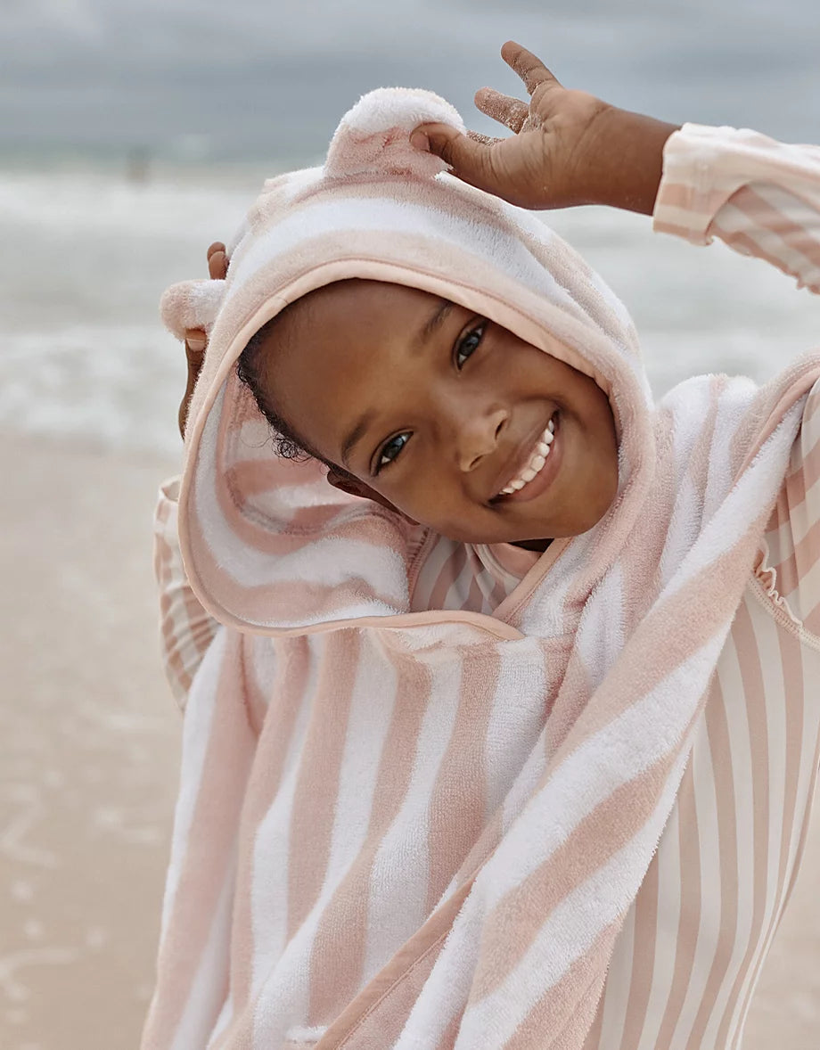 Surfsuits for splashing about, printed swimsuits, and charming swim hats – discover everything little ones need for sunny adventures, be it baby swimwear or baby beachwear. Designed with comfort and play in mind, our collection keeps them protected while letting them move freely in and out of the water. After a splashy fun in the pool or the sea, our striped towelling hoodies make the perfect cover-up, crafted from soft, absorbent fabrics to keep babies warm and cosy.